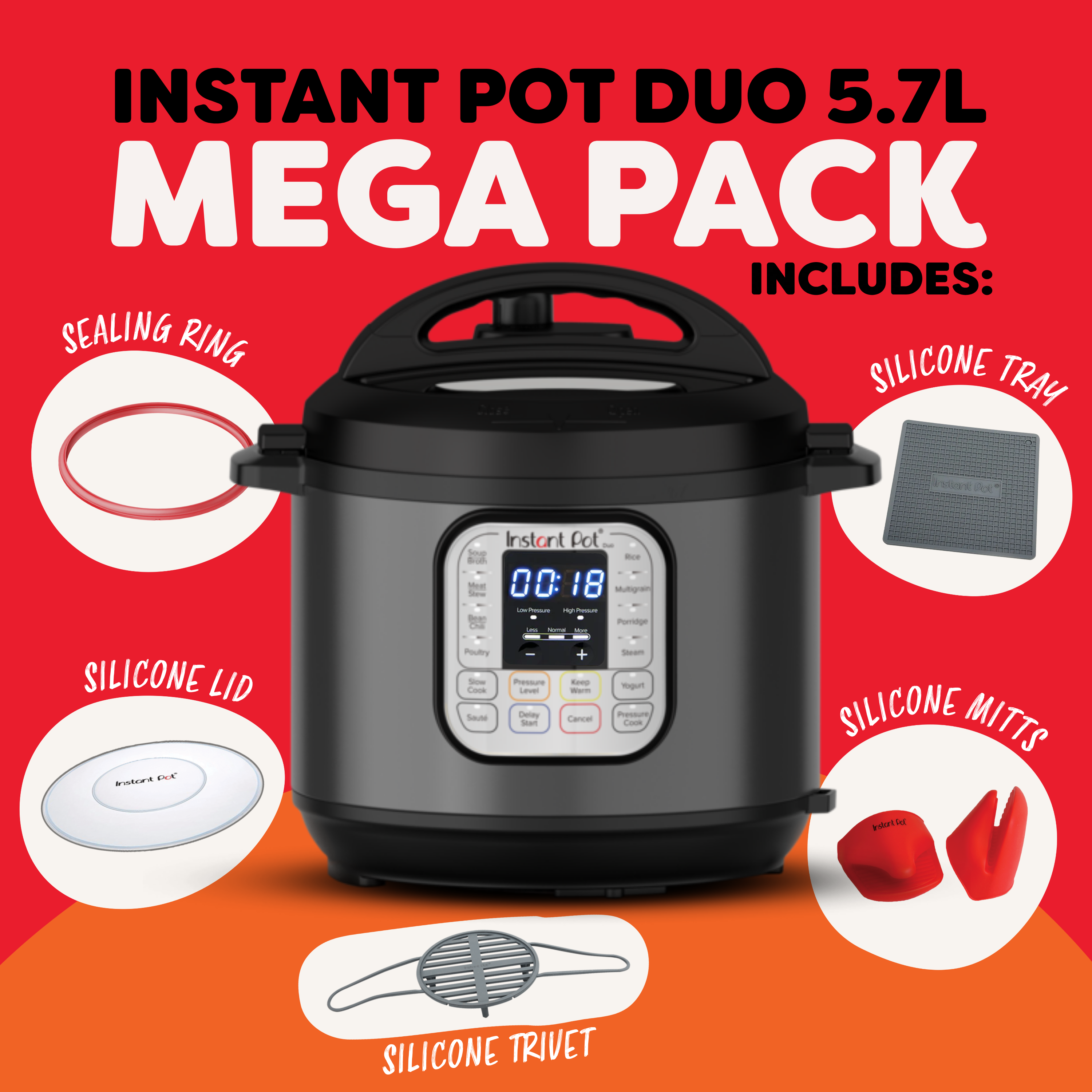 Inside the box, you’ll find handy extras like a silicone trivet, silicone mitts, silicone tray, silicone lid and an extra sealing ring because who doesn’t love accessories? From slow-cooked, melt-in-your-mouth meats to curries, cheesecakes and one-pot pastas, this Mega Pack is ready to handle it all.